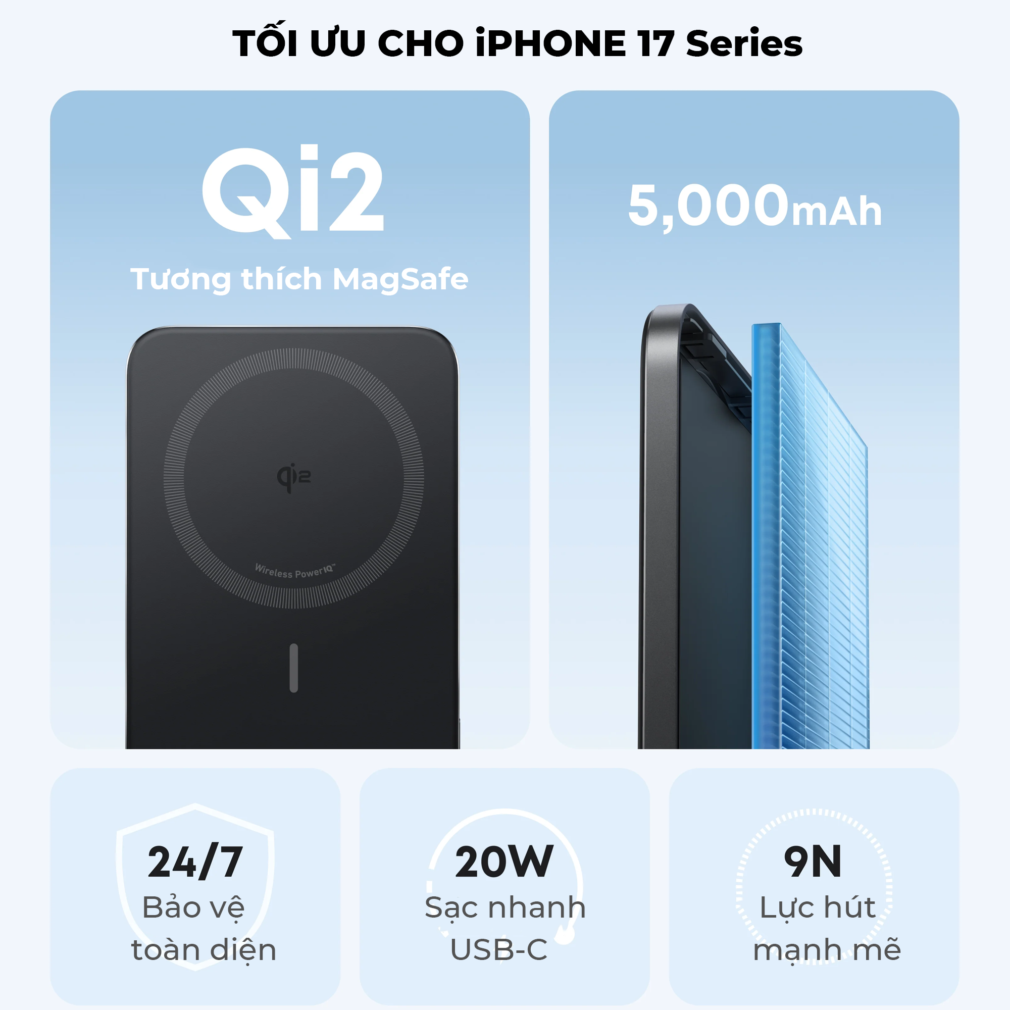 Được chứng nhận Qi2, dung lượng 5.000mAh, kích thước chỉ 8.6mm, nhẹ bằng một nửa trọng lượng iPhone – cho trải nghiệm sạc tiện lợi, tinh tế và siêu gọn gàng mọi lúc mọi nơi.