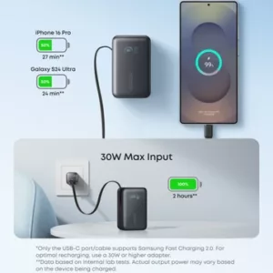Hỗ trợ sạc và nạp lại đồng thời với công suất tối đa 45W (qua cổng USB-C đơn) cho thiết bị và công suất đầu vào tối đa 30W để sạc lại pin nhanh chóng. Chỉ mất 27 phút để sạc iPhone 16 Pro lên 50% và 2 giờ để sạc đầy pin dự phòng.